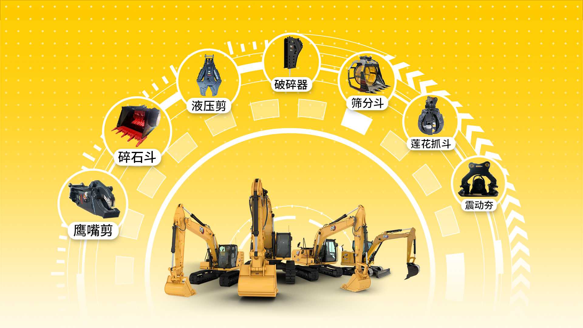 满足多样化施工需求,随心换装,攻无不克,骁勇善战的CAT设备,配备多种多咱的属具工装,逆风前行,绝不躺平。